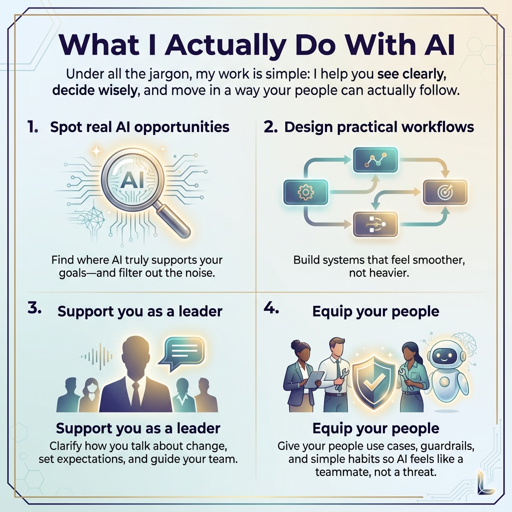 My sweet spot lives in that overlap. I’m part strategist, part systems architect, and part coach. I help you translate big, visionary ideas into grounded, human-friendly change—especially when AI is involved.